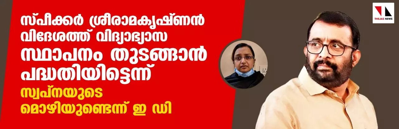 സ്പീക്കര് ശ്രീരാമകൃഷ്ണന് വിദേശത്ത് വിദ്യാഭ്യാസ സ്ഥാപനം തുടങ്ങാന് പദ്ധതിയിട്ടെന്ന് സ്വപ്നയുടെ മൊഴിയുണ്ടെന്ന് ഇ ഡി
