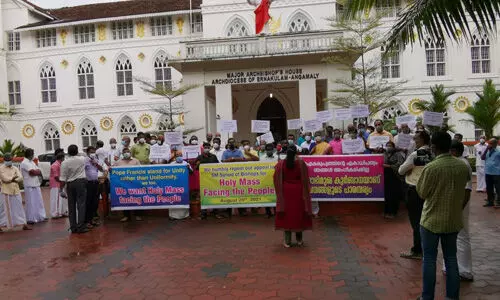 ജനാഭിമുഖ കുര്ബ്ബാന അനുവദിക്കണം; എറണാകുളം ബിഷപ്പ് ഹൗസിനു മുന്നില് വിശ്വാസികളുടെ പ്രതിഷേധം