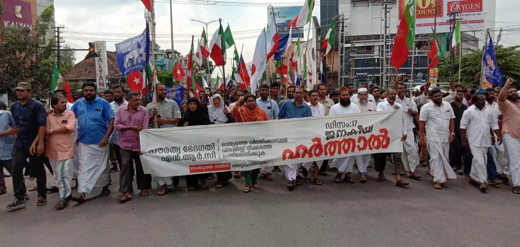 പൗരത്വ നിഷേധത്തിനെതിരായ സംയുക്ത സമിതിയുടെ ഹർത്താൽ സംസ്ഥാനത്ത് പുരോഗമിക്കുന്നു. തിരുവനന്തപുരത്ത് സംയുക്ത സമിതിയുടെ നേതൃത്വത്തിൽ നടത്തിയ സമാധാനപരമായി നടത്തിയ മാർച്ചിൽ പോലിസ് അതിക്രമമുണ്ടായി. അട്ടക്കുളങ്ങരയിൽ നിന്നാരംഭിച്ച മാർച്ച് ഏജീസ് ഓഫിസിന് മുന്നിൽ പോലിസ് തടഞ്ഞു. ബാരിക്കേഡ് തള്ളി മാറ്റാൻ ശ്രമിച്ച പ്രവർത്തകർക്ക് നേരെ പോലിസ് രണ്ടുതവണ ജലപീരങ്കി പ്രയോഗിച്ചു. അതേ സമയം, സംസ്ഥാന വ്യാപകമായി പ്രതിഷേധം തുടരുകയാണ്. പോലിസ് അന്യായമായി നിരവധി നേതാക്കളേയും പ്രവർത്തകരേയും കസ്റ്റഡിയിൽ എടുത്തിട്ടുണ്ട്. അതേസമയം, വിദ്യാർഥികളെ വലച്ചു ഹർത്താൽ ദിനത്തിൽ പരീക്ഷ പ്രഖ്യാപിച്ച വിദ്യാഭ്യാസ ഡയറക്ടറെ ഉപരോധിച്ച കാംപസ് ഫ്രണ്ട് തിരുവനന്തപുരം ജില്ലാ സെക്രട്ടറി അംജദ് ഉൾപ്പെടെയുള്ളവരേ പോലിസ് അറസ്റ്റ് ചെയ്തു.