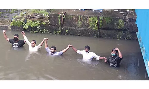 എറണാകുളത്തെ വെള്ളക്കെട്ട്: ബ്രേക്ക് ത്രൂ പദ്ധതി പരാജയമെന്ന് യൂത്ത് കോണ്ഗ്രസ്;വെള്ളം നിറഞ്ഞ കനാലില് ഇറങ്ങി സമരം