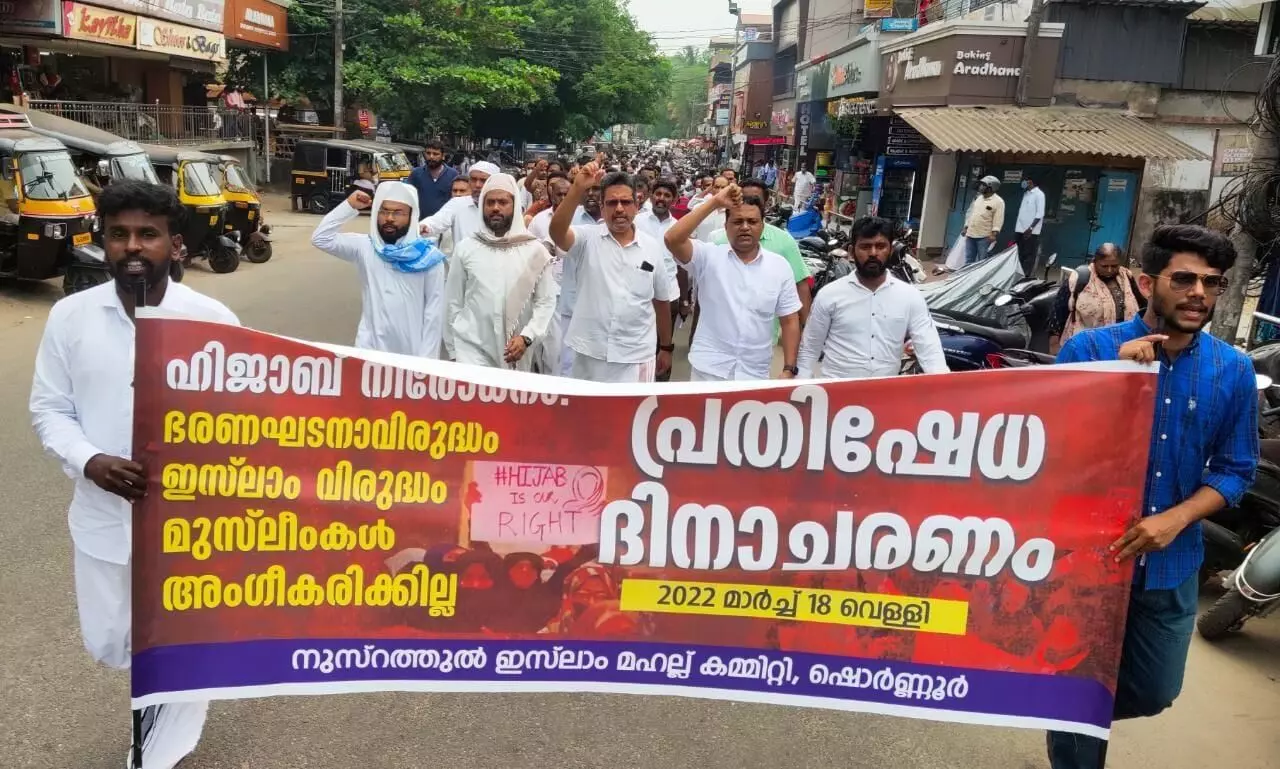 ഹിജാബ് നിരോധനത്തിനെതിരേ ഷൊര്ണൂര് മഹല്ല് കമ്മിറ്റി ജുമാ നമസ്കാരാനന്തരം സംഘടിപ്പിച്ച പ്രതിഷേധ പ്രകടനത്തില് നൂറുകണക്കിന് ആളുകള് പങ്കെടുത്തു. മഹല്ല് പ്രസിഡന്റ് കെ എം ജലീല്, ജോയിന്റ് സെക്രട്ടറി സിദ്ദീഖ് തെക്കേ റോഡ്, മൗലവി ഉനൈസ് അബ്റാരി, ഹാഫിസ് മുഹമ്മദ് ആലം, ഫൈസല് ആലഞ്ചേരി ,ഉമര് ഹുസൈന് എന്നിവര് നേതൃത്വം നല്കി.