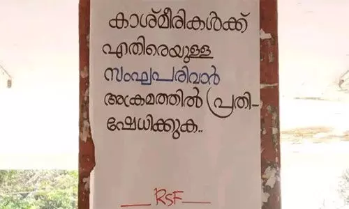 കോഴിക്കോട്: കശ്മീര് പ്രശ്നം പറയുന്ന പോസ്റ്ററുകള് പതിച്ചതിന്റെ പേരില് മലപ്പുറം ഗവ.കൊളേജിലെ വിദ്യാര്ഥികള്ക്കെതിരേ രാജ്യദ്രോഹ കുറ്റം ചുമത്തിയ നടപടി പിന്വലിക്കണമെന്ന് മനുഷ്യാവകാശ പ്രവര്ത്തകരുടെ സംയുക്ത പ്രസ്താവന. റാഡിക്കല് സ്റ്റുഡന്റ്സ് ഫോറം(ആര്എസ്എഫ്) എന്ന വിദ്യാര്ത്ഥി കൂട്ടായ്മയുടെ പ്രവര്ത്തകരായ റിന്ഷാദ്, ഫാരിസ് എന്നീ വിദ്യാര്ത്ഥികള്ക്ക് മേല് 124 എ ചുമത്തി അറസ്റ്റ് ചെയ്തതില് മനുഷ്യാവകാശ പ്രവര്ത്തകര് പ്രതിഷേധിച്ചു.