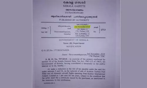 കേരള ഗസറ്റില് അസാധാരണം എന്ന പേരില് പ്രസിദ്ധീകരിച്ചിരിക്കുന്ന സര്ക്കുലറില് പ്രിന്സിപ്പല് സെക്രട്ടറിയാണ് നിര്ദ്ദേശം നല്കിയിരിക്കുന്നത്. കുറഞ്ഞ നിരക്കില് ഇന്ധനം ലഭിക്കുന്നതോടെ കണ്ണൂരില് നിന്നു സര്വ്വീസ് നടത്തുന്ന വിമാന നിരക്ക് കുറക്കാനാണ് കേരള സര്ക്കാര് ലക്ഷ്യം വയ്ക്കുന്നത്. അതേ സമയം, കോഴിക്കോട് വിമാനത്താവളത്തില് നിന്നു കൂടിയ നിരക്ക് തന്നെ വിമാനങ്ങള് ഈടാക്കും.