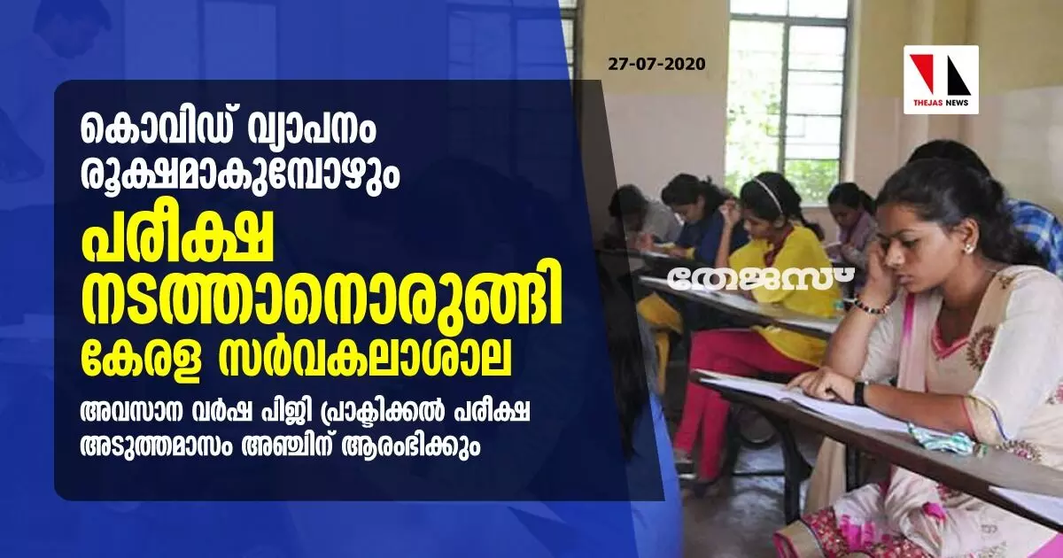 തിരുവനന്തപുരം: കൊവിഡ് വ്യാപനം രൂക്ഷമാകുമ്പോഴും പരീക്ഷ നടത്താനൊരുങ്ങി കേരള സർവകലാശാല. അവസാന വർഷ പിജി പ്രാക്ടിക്കൽ പരീക്ഷ അടുത്ത മാസം അഞ്ചിന് ആരംഭിക്കും. വിദ്യാർഥികളിൽ പലരും താമസിക്കുന്നത് കണ്ടെയ്ൻമെന്റ് സോണുകളിൽ. മതിയായ പ്രാക്ടിക്കൽ ക്ലാസ് പോലും ലഭിച്ചിരുന്നില്ലെന്നും വിദ്യാർഥികൾ പരാതിപ്പെടുന്നു. കീം പരീക്ഷ ഉദാഹരണമായി മുന്നിലുണ്ടായിട്ടും പാഠമുൾക്കൊള്ളാൻ കേരള സർവകലാശാല തയ്യാറല്ല.