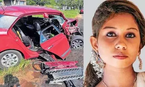 ആലുവ മുപ്പത്തടം മണപ്പുറത്ത് ഹൗസില് അനന്തുവിന്റെ ഭാര്യ വിഷ്ണുപ്രിയ (19) യാണ് മരിച്ചത്. കാറിലുണ്ടായിരുന്ന വിഷ്ണുപ്രിയയുടെ ഭര്ത്താവ് അനന്തു (22) സുഹൃത്തുക്കളായ അഭിജിത്ത് (20), ജിയോ (21) എന്നിവര്ക്ക് അപകടത്തില് ഗുരുതരമായി പരിക്കേറ്റു.