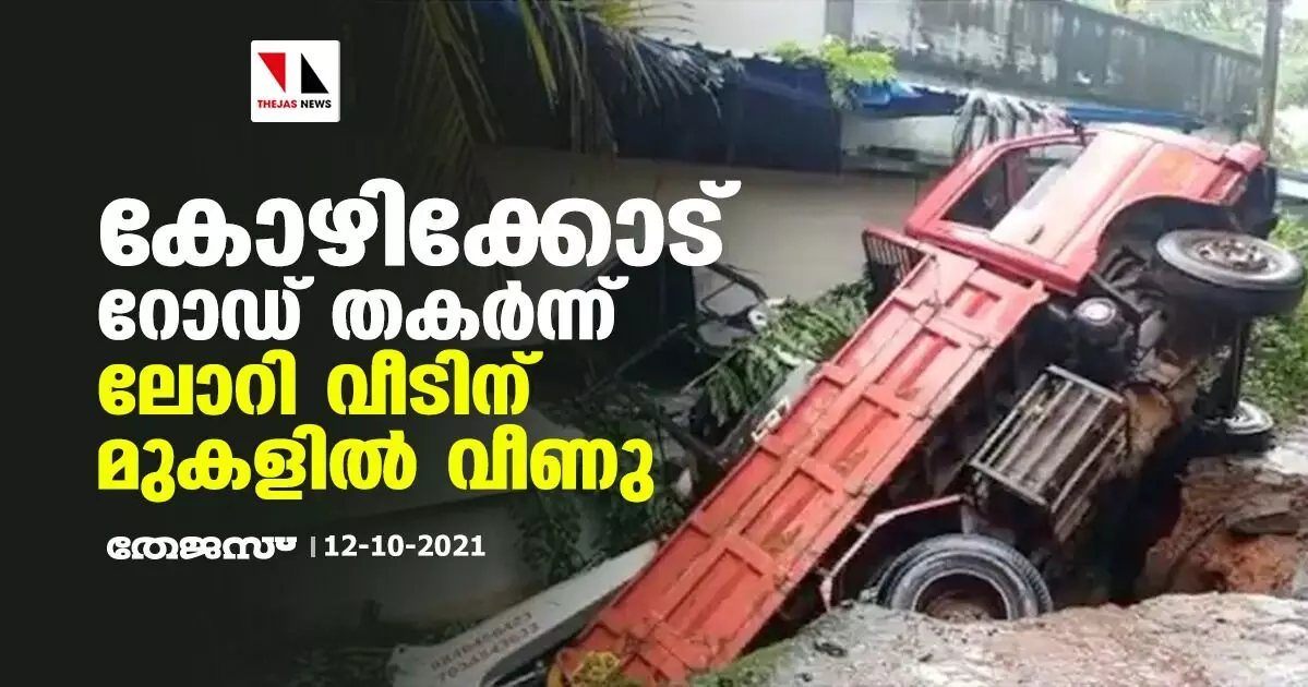 കോഴിക്കോട് റോഡ് തകര്ന്ന് ലോറി വീടിന് മുകളില് വീണു