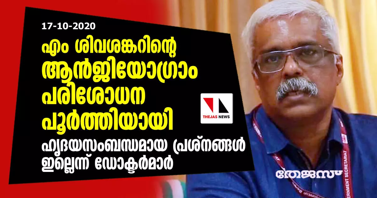 എം ശിവശങ്കറിന്റെ ആന്ജിയോഗ്രാം പരിശോധന പൂർത്തിയായി; ഹൃദയസംബന്ധമായ പ്രശ്നങ്ങൾ ഇല്ലെന്ന് ഡോക്ടർമാർ