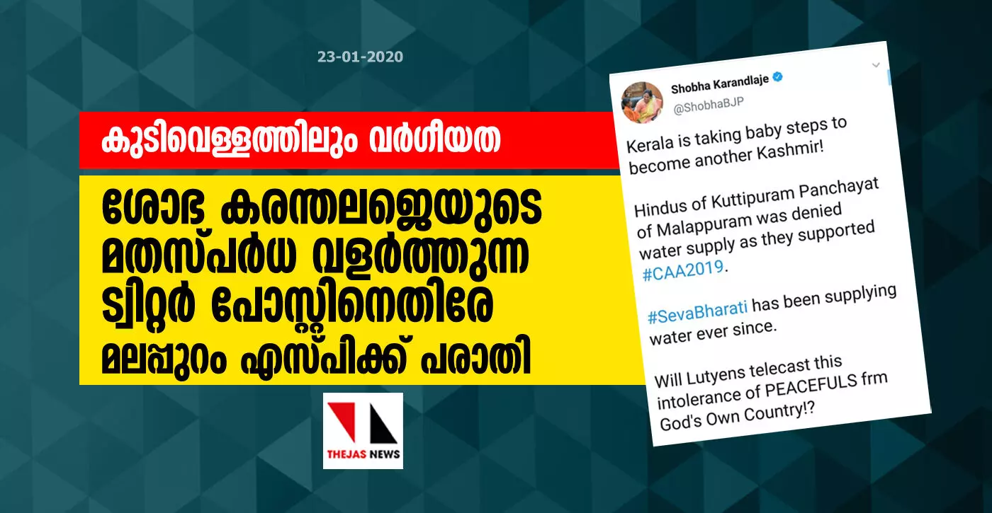 കുടിവെള്ളത്തിലും വര്ഗീയത: ശോഭ കരന്തലജെയുടെ മതസ്പര്ധ വളര്ത്തുന്ന ട്വിറ്റര് പോസ്റ്റിനെതിരേ മലപ്പുറം എസ്പിക്ക് പരാതി