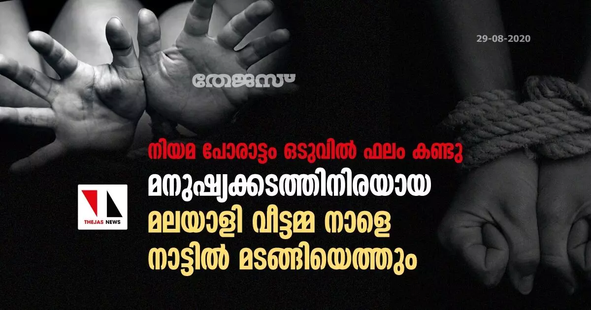 നിയമ പോരാട്ടം ഒടുവില് ഫലം കണ്ടു; മനുഷ്യക്കടത്തിനിരയായ മലയാളി വീട്ടമ്മ നാളെ നാട്ടില് മടങ്ങിയെത്തും