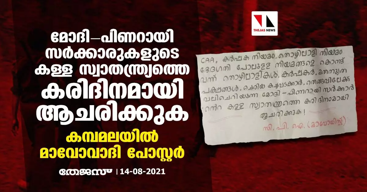 മോദി-പിണറായി സര്ക്കാരിന്റെ കള്ള സ്വാതന്ത്ര്യത്തെ കരിദിനമായി ആചരിക്കുക; കമ്പമലയില് മാവോവാദി പോസ്റ്റര്