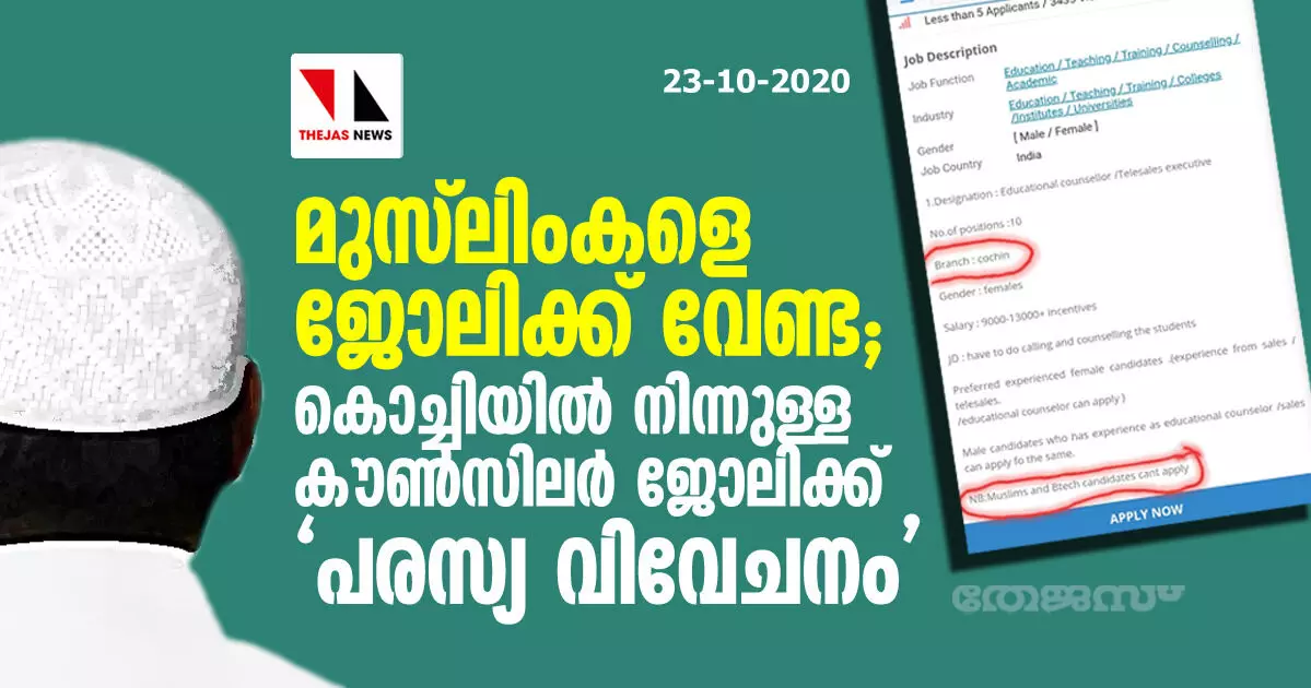 മുസ്ലിംകളെ ജോലിക്ക് വേണ്ട; കൊച്ചിയില് നിന്നുള്ള കൗണ്സിലര് ജോലിക്ക് 'പരസ്യ വിവേചനം'