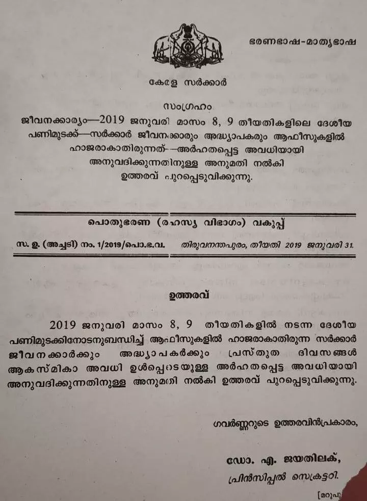 പണിമുടക്കില് പങ്കെടുത്തവര്ക്ക് ശമ്പളം നഷ്ടമാവില്ല; അവധി അനുവദിച്ച് സര്ക്കാര് ഉത്തരവിറങ്ങി