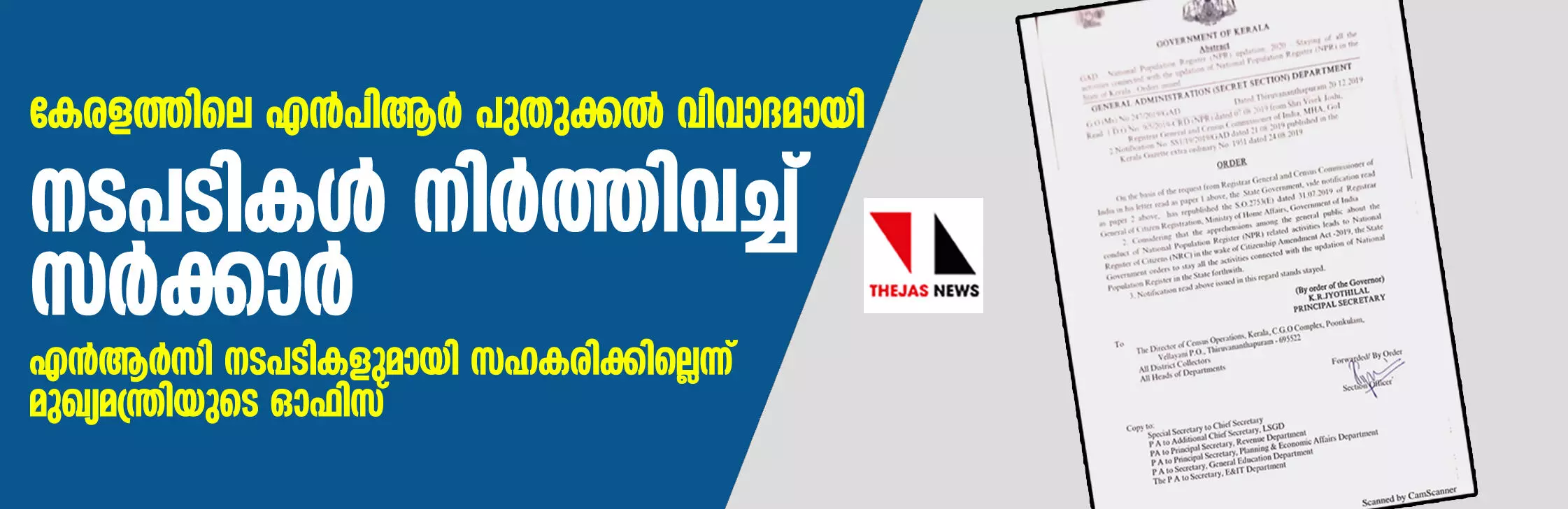 2019 ലെ പൗരത്വ നിയമഭേദഗതിയുടെ പശ്ചാത്തലത്തില് ഉയര്ന്നുവന്നിട്ടുള്ള ആശങ്കകള്കൂടി കണക്കിലെടുത്ത് ദേശീയ പൗരത്വ രജിസ്റ്റര് (എന്ആര്സി) തയ്യാറാക്കുന്നതിന് സഹായകമായവിധം ദേശീയ ജനസംഖ്യാ രജിസ്റ്റര് (എന്പിആര്) പുതുക്കുന്നതിനുള്ള നടപടികളുമായി യാതൊരു കാരണവശാലും സംസ്ഥാന സര്ക്കാര് സഹകരിക്കില്ല. 10 വര്ഷത്തിലൊരിക്കല് നടത്തിവരുന്ന കനേഷുമാരി (സെന്സസ്)ക്ക് എല്ലാവിധ സഹായ സഹകരണങ്ങളും സംസ്ഥാന സര്ക്കാര് എക്കാലത്തും നല്കിവന്നിട്ടുണ്ട്. രാജ്യത്തെ ജനസംഖ്യാ കണക്കെടുപ്പ് അനിവാര്യമായ ഒരു സ്ഥിതിവിവരക്കണക്കായതിനാല് നിലവിലുള്ള രീതിയില് സെന്സസിനോടുള്ള സഹകരണം തുടരാന് സംസ്ഥാന സര്ക്കാര് പ്രതിജ്ഞാബദ്ധമാണെന്നും മുഖ്യമന്ത്രിയുടെ ഓഫിസ് കൂട്ടിച്ചേര്ത്തു. എന്പിആര് വഴി രാജ്യത്ത് കടന്ന റോഹിന്ഗ്യന് മുസ്ലിംകളെ കണ്ടെത്തുമെന്ന് നേരത്തെ കേന്ദ്ര ആഭ്യന്തര മന്ത്രി അമിത് ഷാ വ്യക്തമാക്കിയിരുന്നു. ഇതോടെയാണ് പൗരത്വ രജിസ്റ്റര് നടപ്പാക്കുന്നതിന് മുന്നോടിയായാണ് ജനസംഖ്യാ കണക്കെടുപ്പ് വരുന്നതെന്ന റിപോര്ട്ടുകള് പുറത്തുവന്നത്.