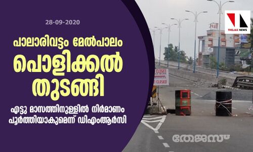കൊച്ചി: തകരാറിലാതിനെ തുടര്ന്ന് ഗതാഗതം നിരോധിച്ച പാലാരിവട്ടം മേല്പ്പാലത്തിന്റെ പൊളിക്കല് പൂര്ണമായി. നിശ്ചയിച്ചിരുന്നതിലും പത്തു ദിവസം മുമ്പേ പൊളിക്കല് തീര്ക്കാന് സാധിച്ചു. ഡിഎംആര്സിയുടെ മേല്നോട്ടത്തിലാണ് പാലത്തിന്റെ പുനര് നിര്മാണപണികള് പുരോഗമിക്കുന്നത്. ഡിഎംആര്സിയുടെ കളമശേരി യാര്ഡില് നിര്മിക്കുന്ന ഗര്ഡറുകള് ഇന്നലെ രാത്രിമുതല് പാലത്തില് സ്ഥാപിച്ചു തുടങ്ങി. കൂറ്റന് ഗര്ഡറുകള് ഉയര്ത്തി പിയര്ക്യാപ്പുകളിലേക്കു വയ്ക്കുന്നത് ഗതാഗത തടസത്തിനു കാരണമാകുമെന്നതിനാലാണ് ജോലികള് രാത്രിയിലേക്ക് മാറ്റിയത്.