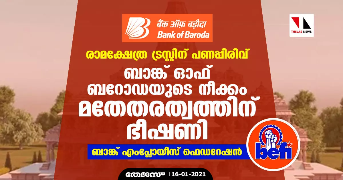 രാമക്ഷേത്ര ട്രസ്റ്റിന് പണപ്പിരിവ്: ബാങ്ക് ഓഫ് ബറോഡയുടെ നീക്കം മതേതരത്വത്തിന് ഭീഷണി- ബാങ്ക് എംപ്ലോയീസ് ഫെഡറേഷന്