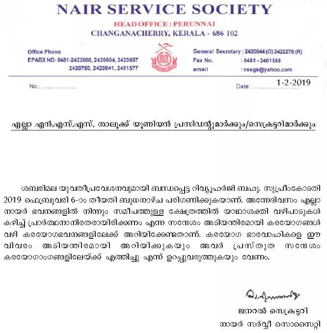 ശബരിമല റിവ്യൂ ഹരജി: നായര് ഭവനങ്ങളില് വഴിപാട് നടത്താന് എന്എസ്എസ് സര്ക്കുലര്