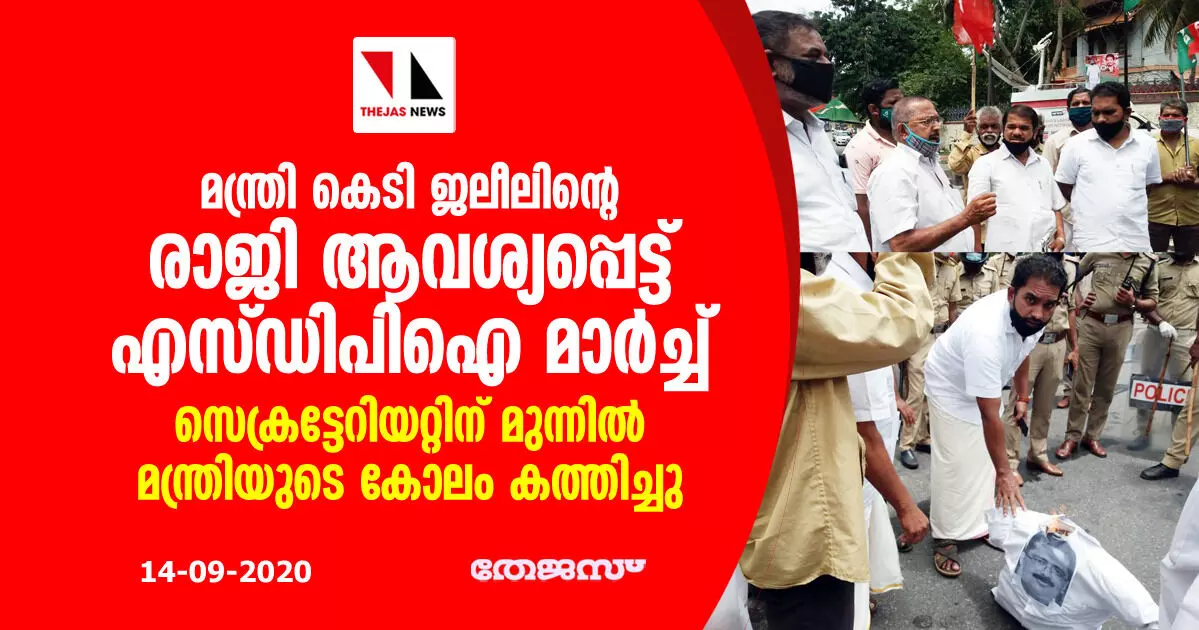 മന്ത്രി കെ ടി ജലീലിൻ്റെ രാജി ആവശ്യപ്പെട്ട് എസ്ഡിപിഐ മാർച്ച്; സെക്രട്ടേറിയറ്റിന് മുന്നിൽ മന്ത്രിയുടെ കോലം കത്തിച്ചു
