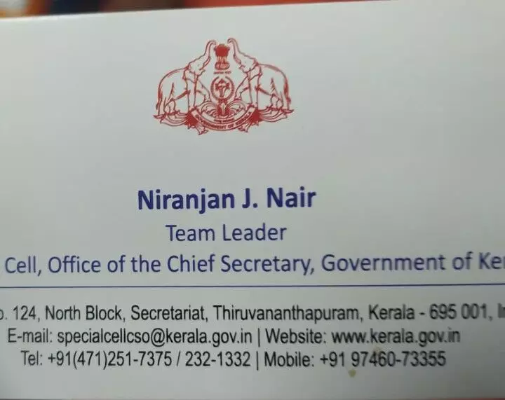 ചീഫ് സെക്രട്ടറിയുടെ സ്പെഷ്യൽ സെൽ ടീം ലീഡർ നിരഞ്ജൻ ജെ നായർ, ഡെപ്യൂട്ടി ലീഡർ കവിത സി പിള്ള എന്നിവർ സർക്കാർ മുദ്രയുള്ള വിസിറ്റിങ് കാർഡ് ഉപയോഗിക്കുന്നതിന്റെ തെളിവുകളാണ് പുറത്ത് വന്നത്.