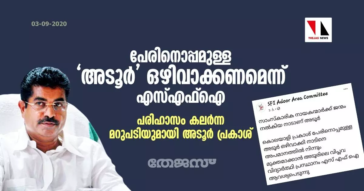 തിരുവനന്തപുരം: പേരിനൊപ്പമുള്ള 'അടൂർ' ഒഴിവാക്കണമെന്ന് എസ്എഫ്ഐയുടെ ആവശ്യത്തിന് പരിഹാസം കലർന്ന മറുപടിയുമായി അടൂർ പ്രകാശ് എംപി. വെഞ്ഞാറമൂട് ഇരട്ടക്കൊലപാതകത്തിൻ്റെ പശ്ചാത്തലത്തിൽ എസ്എഫ്ഐ അടൂർ ഏരിയാ കമ്മിറ്റിയുടെ ഫേസ് ബുക്ക് പോസ്റ്റിന് മറുപടിയായാണ് അടൂർ പ്രകാശിൻ്റെ പ്രതികരണം. സാംസ്കാരിക നായകന്മാർക്ക് ജൻമം നൽകിയ നാടാണ് അടൂരെന്നും കൊലയാളി പ്രകാശ് പേരിനൊപ്പമുള്ള അടൂർ ഒഴിവാക്കി നാടിനെ അപമാനമുക്തമാക്കണമെന്നും എസ്എഫ്ഐ ആവശ്യപ്പെട്ടിരുന്നു.