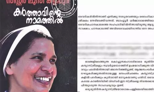സിസ്റ്റര് ലൂസി എഴുതിയ 'കര്ത്താവിന്റെ നാമത്തില്' എന്ന പുസ്തകത്തില് വൈദികര്ക്കെതിരേ ഗുരുതര ആരോപണങ്ങളാണ് ഉയര്ത്തിയിരിക്കുന്നത്. മഠങ്ങളില് സന്ദര്ശകരെന്ന വ്യാജേനയെത്തി വൈദികര് ലൈംഗിക ചൂഷണം നടത്താറുണ്ടെന്നാണ് സിസ്റ്റര് ലൂസി കളപ്പുരയുടെ വെളിപ്പെടുത്തല്. കന്യാസ്ത്രീയായതിനുശേഷം തന്നെ നാലുതവണ വൈദികര് ലൈംഗികമായി പീഡിപ്പിക്കാന് ശ്രമിച്ചെന്നും സിസ്റ്റര് ആരോപിക്കുന്നുണ്ട്. കൊട്ടിയൂര് കേസിലെ പ്രതി ഫാദര് റോബിന് പല കന്യാസ്ത്രീകളുമായും ബന്ധമുണ്ടായിരുന്നു. മഠത്തില് കഴിഞ്ഞിരുന്ന ഒരു കന്യാസ്ത്രീ പ്രസവിച്ചതായും ഇതില് ഉത്തരവാദിയായ വൈദികനെ സഭ സംരക്ഷിച്ചെന്നും സിസ്റ്റര് പുസ്തകത്തില് പറയുന്നുണ്ട്.