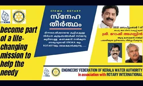 തിരുവനന്തപുരം: മാതാപിതാക്കള് പകര്ന്നുകൊടുക്കുന്ന സ്നേഹം പോലും തിരിച്ചറിയാന് കഴിയാത്ത ഭിന്നശേഷിക്കാരായ കുട്ടികളുള്ള നിര്ധന കുടുംബങ്ങള്ക്ക് സൗജന്യ കുടിവെള്ളം നല്കാനുള്ള ജലവിഭവ മന്ത്രി റോഷി അഗസ്റ്റിന്റെ പ്രഖ്യാപനം യാഥാര്ഥ്യമാവുന്നു. എന്ജിനിയേഴ്സ് ഫെഡറേഷന് ഓഫ് കേരളാ വാട്ടര് അതോറിറ്റിയും റോട്ടറി ഇന്റര്നാഷനലും സംയുക്തമായി ചേര്ന്നാണ് പദ്ധതി നടപ്പാക്കുന്നത്. തിരുവനന്തപുരം വെട്ടുകാടുള്ള സെറിബ്രല് പാള്സി രോഗം ബാധിച്ച കുട്ടിയുടെ വീട്ടിലേക്ക് കുടിവെള്ള കണക്ഷന് നല്കി മന്ത്രി റോഷി അഗസ്റ്റിന് 'സ്നേഹ തീര്ഥം' എന്നു പേരിട്ടിരിക്കുന്ന പദ്ധതിയുടെ ഉദ്ഘാടനം ബുധനാഴ്ച നിര്വഹിക്കും.