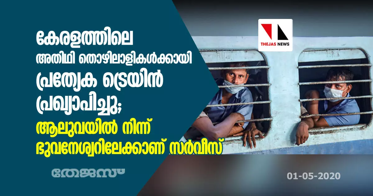 തിരുവനന്തപുരം: കേരളത്തിൽ കഴിയുന്ന അതിഥി തൊഴിലാളികൾക്കായി സ്പെഷ്യൽ ട്രെയിൻ പ്രഖ്യാപ്പിച്ചു. ആലുവയിൽ നിന്ന് ഭുവനേശ്വറിലേക്കാണ് സർവീസ് ആരംഭിക്കുന്നത്. ട്രെയിൻ ഇന്ന് വൈകീട്ട് ആറിന് പുറപ്പെടും. 1200 പേരെയാണ് ഈ ട്രെയിനില് കൊണ്ടുപോവുക. പെരുമ്പാവൂര്, ആലുവ മേഖലകളിലെ ഒഡീഷ തൊഴിലാളികളെയാണ് ഇന്ന് കൊണ്ടുപോകുക. ഇതിനായുള്ള പട്ടിക ജില്ലാഭരണകൂടം തയ്യാറാക്കി. കൊവിഡിന്റെ പശ്ചാത്തലത്തിൽ പ്രഖ്യാപ്പിച്ച പ്രത്യേക ട്രെയിനാണിത്. അതിനാൽ മറ്റെവിടെയും സ്റ്റോപ്പ് ഉണ്ടാകില്ല.