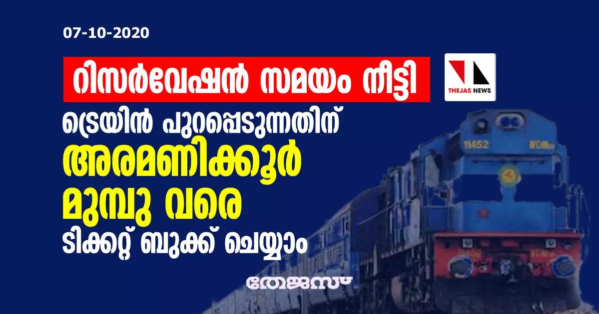 തിരുവനന്തപുരം: ട്രെയിൻ പുറപ്പെടുന്നതിന് അരമണിക്കൂർ മുമ്പുവരെ ഇനി ടിക്കറ്റ് റിസർവ് ചെയ്യാം. ഓൺലൈനിലും ടിക്കറ്റ് റിസർവേഷൻ കൗണ്ടറുകളിലും അതുവരെ ടിക്കറ്റ് ലഭിക്കുമെന്ന് അധികൃതർ അറിയിച്ചു. ഒക്ടോബർ പത്തുമുതൽ ഈ ക്രമീകരണം നടപ്പാക്കും.