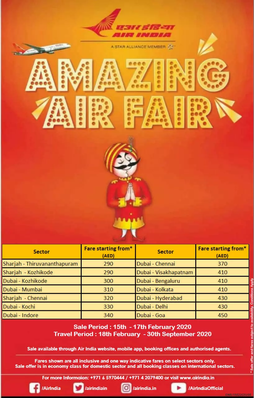 വന് നിരക്കിളവുമായി എയര് ഇന്ത്യ കേരളത്തിലേക്ക് 290 ദിര്ഹം മാത്രം