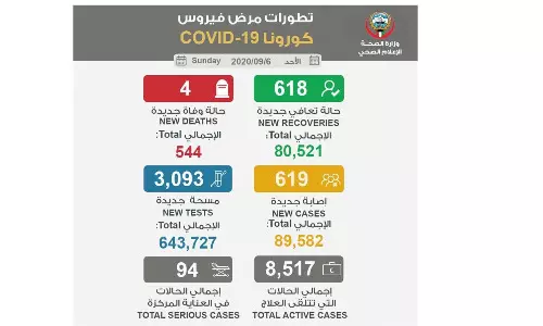 കുവൈത്ത് സിറ്റി: കുവൈത്തില് കൊവിഡ് ബാധിച്ച് ഇന്ന് നാലുപേര് കൂടി മരിച്ചു. ഇതോടെ രാജ്യത്ത് കൊറോണ ബാധിച്ച് മരണപ്പെട്ടവരുടെ എണ്ണം 544 ആയി. രോഗികളുടെ എണ്ണത്തില് ഇന്നും വര്ധനവാണുണ്ടായത്. 619 പേര്ക്കാണ് ഇന്ന് രോഗ ബാധ സ്ഥിരീകരിച്ചത്. ഇതടക്കം ആകെ കൊറോണ വൈറസ് സ്ഥിരീകരിച്ചവരുടെ എണ്ണം 89582 ആയി. ഇന്ന് രോഗം സ്ഥിരീകരിച്ചവരുടെ ആരോഗ്യ മേഖല തിരിച്ചുള്ള കണക്ക് ഇപ്രകാരമാണ്: അഹമ്മദി 128, ജഹ്റ 73, ഫര്വാനിയ 108, ഹവല്ലി 182, കാപിറ്റല് 128. ഇന്ന് 618 പേരാണ് രോഗ മുക്തരായത്. ഇതോടെ ആകെ രോഗം ഭേദമായവരുടെ എണ്ണം 80521 ആയി. ആകെ 8517 പേരാണ് ഇപ്പോള് ചികില്സയില് കഴിയുന്നത്. തീവ്ര പരിചരണത്തില് കഴിയുന്നവരുടെ എണ്ണം 94 ആയി. കഴിഞ്ഞ 24 മണിക്കൂറിനിടയില് 3093 പേര്ക്കാണ് കൊറോണ വൈറസ് പരിശോധന നടത്തിയത്. ഇതോടെ ആകെ പരിശോധന നടത്തിയവരുടെ എണ്ണം 643727 ആയി.