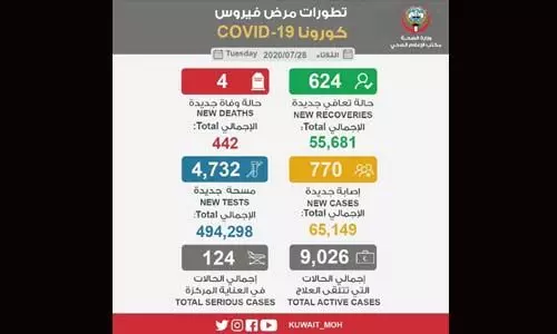 ഫര്വാനിയ- 143, അഹമദി- 236, ഹവല്ലി- 132, കേപിറ്റല്- 63, ജഹറ- 196. ഇന്ന് 624 പേരാണ് രോഗ മുക്തരായത്. ഇതോടെ ആകെ രോഗം സുഖമായവരുടെ എണ്ണം 55,681 ആയി. ആകെ 9,026 പേരാണ് ഇപ്പോള് ചികില്സയില് കഴിയുന്നത്. ഇവരില് 124 പേര് തീവ്രപരിചരണ വിഭാഗത്തില് കഴിയുന്നവരുമാണ്. കഴിഞ്ഞ 24 മണിക്കൂറിനിടയില് 4,732 പേര്ക്കാണ് വൈറസ് പരിശോധന നടത്തിയത്. ഇതോടെ ആകെ പരിശോധന നടത്തിയവരുടെ എണ്ണം 4,94,298 ആയി.