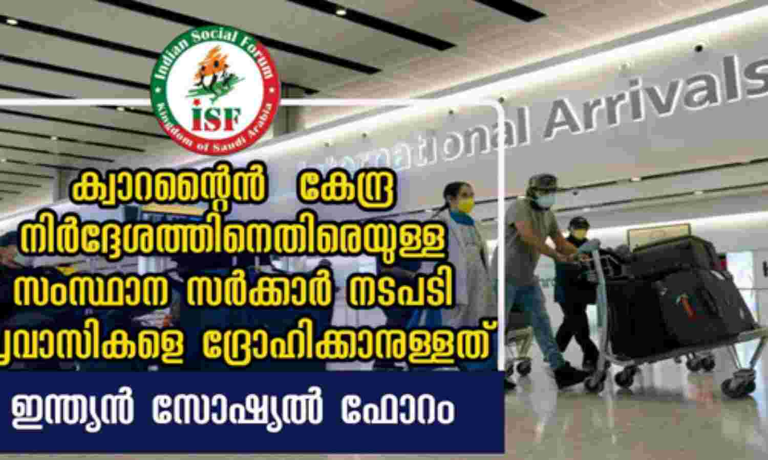 കൊവിഡ് ക്വാറന്റൈന്: കേന്ദ്ര നിര്ദേശത്തിനെതിരായ സംസ്ഥാന സര്ക്കാര് നടപടി പ്രവാസികളെ ദ്രോഹിക്കാനുള്ളത്- ഇന്ത്യന് സോഷ്യല് ഫോറം