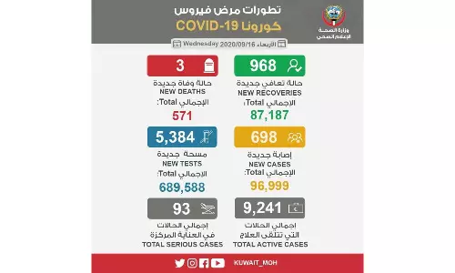കുവൈത്ത് സിറ്റി: കൊവിഡ് ബാധിച്ച് കുവൈത്തില് ഇന്ന് മൂന്നുപേര് മരിച്ചു. ഇതോടെ രാജ്യത്ത് കൊറോണ വൈറസ് ബാധയെ തുടര്ന്ന് മരണമടഞ്ഞവരുടെ എണ്ണം 571 ആയി. 698 പേര്ക്കാണ് ഇന്ന് രോഗം സ്ഥിരീകരിച്ചത്. ഇതുള്പ്പെടെ ഇന്നുവരെ ആകെ കൊറോണ വൈറസ് ബാധിതരുടെ എണ്ണം 96999 ആയി. ഇന്ന് രോഗ ബാധ റിപോര്ട്ട് ചെയ്യപ്പെട്ടവരുടെ ആരോഗ്യ മേഖല തിരിച്ചുള്ള കണക്ക്: അഹമ്മദി 171, ജഹ്റ 84, ഫര്വാനിയ 138, ഹവല്ലി 168, കാപിറ്റല് 137. ഇന്ന് 968 പേരാണ് രോഗ മുക്തരായത്. ഇതോടെ ആകെ രോഗം സുഖമായവരുടെ എണ്ണം 87187 ആയി. ആകെ 9241 പേരാണ് ഇപ്പോള് ചികില്സയില് കഴിയുന്നത്. തീവ്ര പരിചരണത്തില് കഴിയുന്നവരുടെ എണ്ണം നൂറില് താഴെയായി കുറഞ്ഞു-93. കഴിഞ്ഞ 24 മണിക്കൂറിനിടെ 5384 പേര്ക്കാണ് കൊറോണ പരിശോധന നടത്തിയത്. ഇതോടെ ആകെ പരിശോധന നടത്തിയവരുടെ എണ്ണം 689688 ആയി.