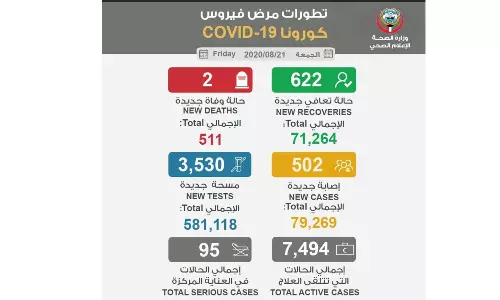 കൊവിഡ്: കുവൈത്തില് ഇന്ന് രണ്ടുമരണം; 502 പേര്ക്കു രോഗം, 622 പേര്ക്ക് രോഗമുക്തി
