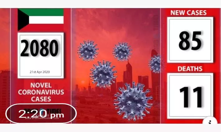 ഇന്ന് റിപോര്ട്ട് ചെയ്യപ്പെട്ട ആകെ 85 രോഗികളില് 72 പേര്ക്ക് രോഗബാധയേറ്റവരുമായുള്ള സമ്പര്ക്കം വഴിയും 6 പേരുടെ രോഗബാധയുടെ ഉറവിടം അന്വേഷണത്തിലുമാണ്. 7 പേര്ക്ക് യുഎഇ, ഖത്തര്, ബഹറയ്ന് എന്നീ രാജ്യങ്ങളില് യാത്ര ചെയ്തതുമായി ബന്ധപ്പെട്ടാണ് രോഗ ബാധയേറ്റത്. ഇന്ത്യക്കാര്ക്കു പുറമെ ഇന്ന് രോഗ ബാധയേറ്റ മറ്റു രാജ്യക്കാരുടെ എണ്ണം ഇപ്രകാരമാണ്. സ്വദേശികള്-17, ഈജിപ്തുകാര്-8, ബംഗ്ലാദേശികള്-8, പാകിസ്താനി-5, സിറിയ-5, ഇറാന്-3, ഫലസ്തീന്-1, പോര്ച്ചുഗീസ് 1, ജോര്ദ്ദാന് 1. രാജ്യത്ത് ഇന്ന് വരെ രോഗ ബാധയേറ്റവരുടെ എണ്ണം ഇതോടെ 2080 ആയി. ആകെ 1657 പേരാണ് ഇപ്പോള് ചികില്സയില് കഴിയുന്നത്. ഇവരില് 46 പേര് തീവ്ര പരിചരണ വിഭാഗത്തില് കഴിയുന്നവരാണ്. ഇവരില് 26 പേരുടെ നില അതീവ ഗുരുതരമായി തുടരുകയാണെന്നും ആരോഗ്യമന്ത്രാലയ വക്താവ് അബ്ദുല്ല അല് സനദ് വ്യക്തമാക്കി.