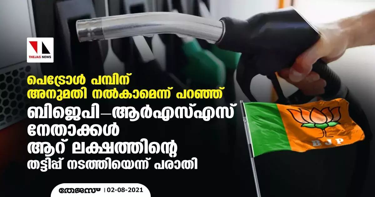 പെട്രോള് പമ്പിന് അനുമതി നല്കാമെന്ന് പറഞ്ഞ് ബിജെപി- ആര്എസ്എസ് നേതാക്കള് ആറ് ലക്ഷത്തിന്റെ തട്ടിപ്പ് നടത്തിയെന്ന് പരാതി