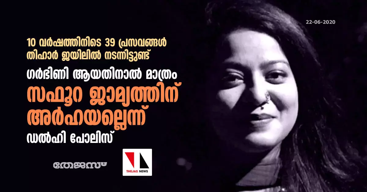10 വര്ഷത്തിനിടെ 39 പ്രസവങ്ങള് തിഹാര് ജയിലില് നടന്നിട്ടുണ്ട്, ഗര്ഭിണി ആയതിനാല് മാത്രം സഫൂറ ജാമ്യത്തിന് അര്ഹയല്ലെന്ന് ഡല്ഹി പോലിസ്