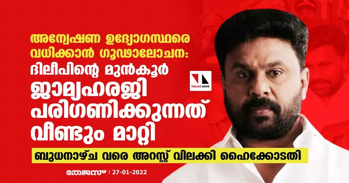 അന്വേഷണ ഉദ്യോഗസ്ഥരെ വധിക്കാന് ഗൂഢാലോചന:ദിലീപിന്റെ മുന്കൂര് ജാമ്യഹരജി പരിഗണിക്കുന്നത് വീണ്ടും മാറ്റി;ബുധനാഴ്ച വരെ അറസ്റ്റ് വിലക്കി ഹൈക്കോടതി