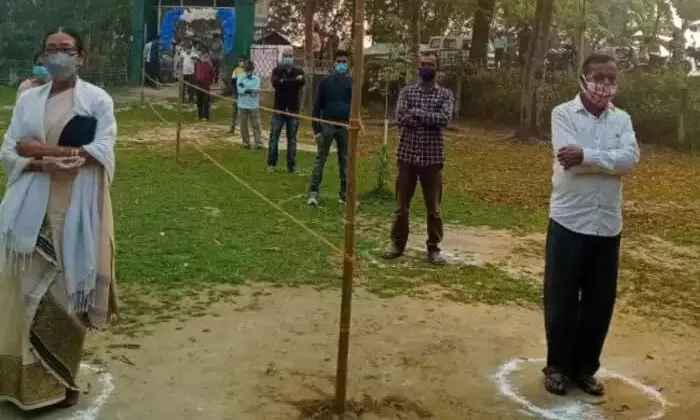 മജൂലിയിലെ കമല ബാരി ജൂനിയര് ബേസിക് സ്കൂളില് സ്ഥാപിച്ച പോളിങ് സ്റ്റേഷനില് വോട്ടര്മാര് ശാരീരിക അകലം വോട്ട് ചെയ്യാന് നില്ക്കുന്നു
