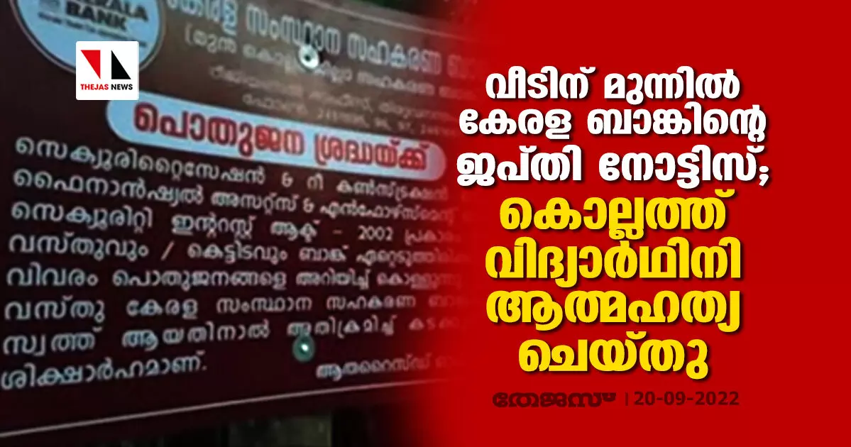 വീടിന് മുന്നിൽ കേരള ബാങ്കിന്റെ ജപ്തി നോട്ടിസ്; കൊല്ലത്ത് വിദ്യാർഥിനി ആത്മഹത്യ ചെയ്തു