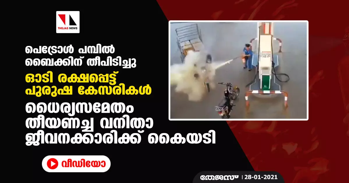 പെട്രോള് പമ്പില് ബൈക്കിന് തീപിടിച്ചു; ഓടി രക്ഷപ്പെട്ട് പുരുഷ കേസരികള്; ധൈര്യസമേതം തീയണച്ച വനിതാ ജീവനക്കാരിക്ക് കൈയടി (വീഡിയോ)