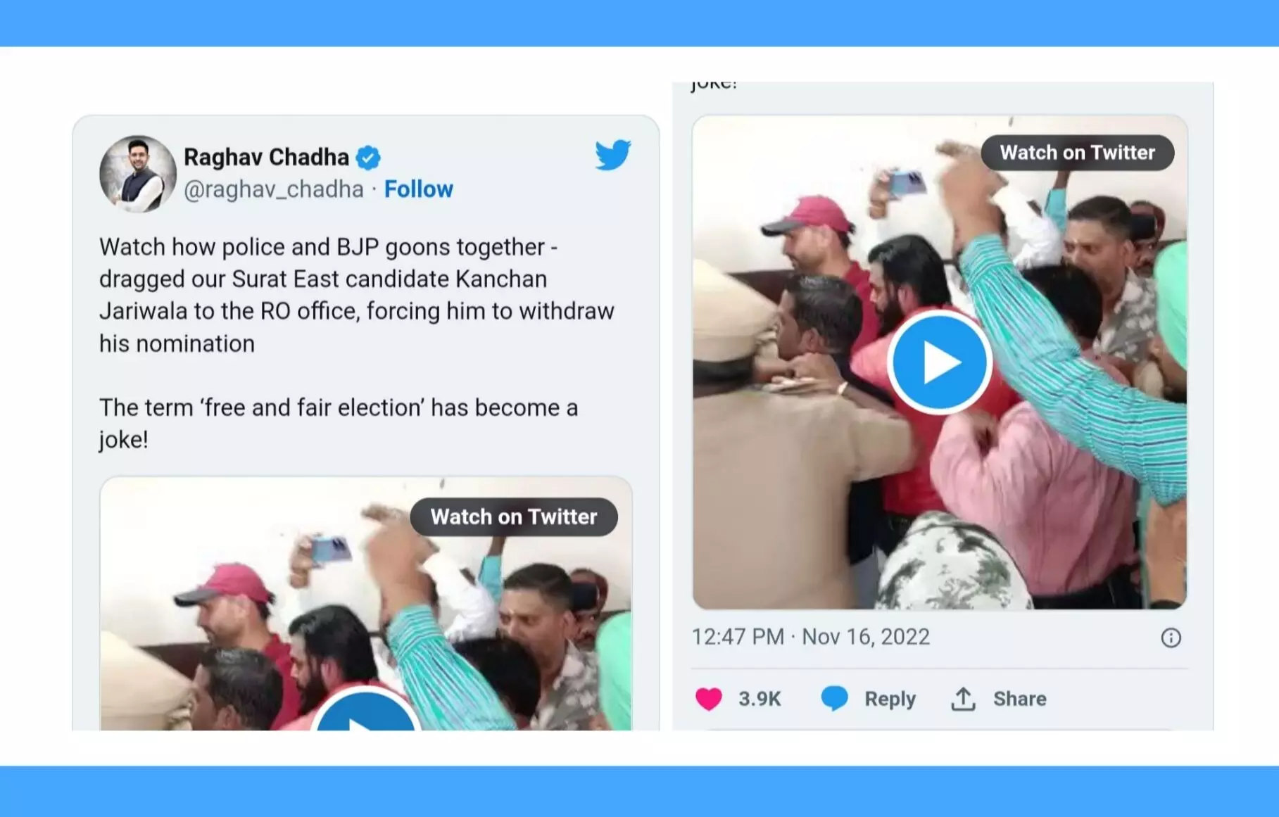 "പൊലീസും ബിജെപി ഗുണ്ടകളും ചേർന്ന് - ഞങ്ങളുടെ സൂറത്ത് ഈസ്റ്റ് സ്ഥാനാർത്ഥി കാഞ്ചൻ ജരിവാലയെ റിട്ടേണിംഗ് ഓഫീസറുടെ ഓഫീസിലേക്ക് വലിച്ചിഴച്ച് നാമനിർദ്ദേശ പത്രിക പിൻവലിക്കാൻ ആവശ്യപ്പെടുന്നത് കാണുക" ചദ്ദ ഒരു ട്വീറ്റിൽ പറഞ്ഞു. 'സ്വാതന്ത്ര്യവും നീതിയുക്തവുമായ തിരഞ്ഞെടുപ്പ്' എന്ന പദം ഒരു തമാശയായി മാറിയിരിക്കുന്നു! അദ്ദേഹം ട്വിറ്ററില് കുറിച്ചു.