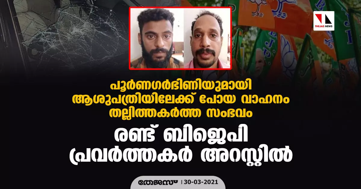 പൂര്ണഗര്ഭിണിയുമായി ആശുപത്രിയിലേക്ക് പോയ വാഹനം തല്ലിത്തകര്ത്ത സംഭവം: രണ്ട് ബിജെപി പ്രവര്ത്തകര് അറസ്റ്റില്