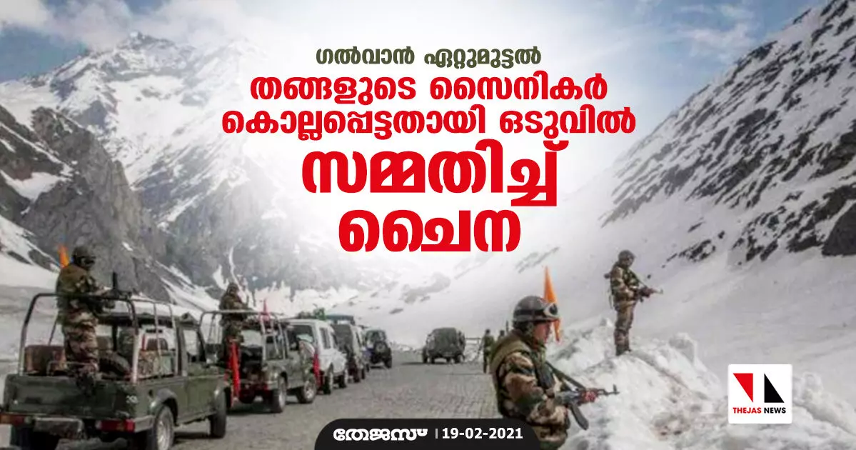 2020 ജൂണില് നടന്ന ഏറ്റുമുട്ടലില് കാരക്കോറം പര്വതനിരകളില് വിന്യസിച്ച അഞ്ചു അതിര്ത്തി സൈനികര് കൊല്ലപ്പെട്ടെന്നാണ് ഗ്ലോബല് ടൈംസ് റിപ്പോര്ട്ട് ചെയ്യുന്നത്. മരിച്ച സൈനികരുടെ പേര് വിവരങ്ങള് ചൈന പുറത്ത് വിട്ടു. ഇവര്ക്ക് മരണാനന്തര ബഹുമതിയും പ്രഖ്യാപിച്ചു. ഇതാദ്യമായാണ് ചൈന തങ്ങളുടെ സൈനികര് മരിച്ചെന്ന് ഔദ്യോഗികമായി സ്ഥിരീകരിക്കുന്നത്.