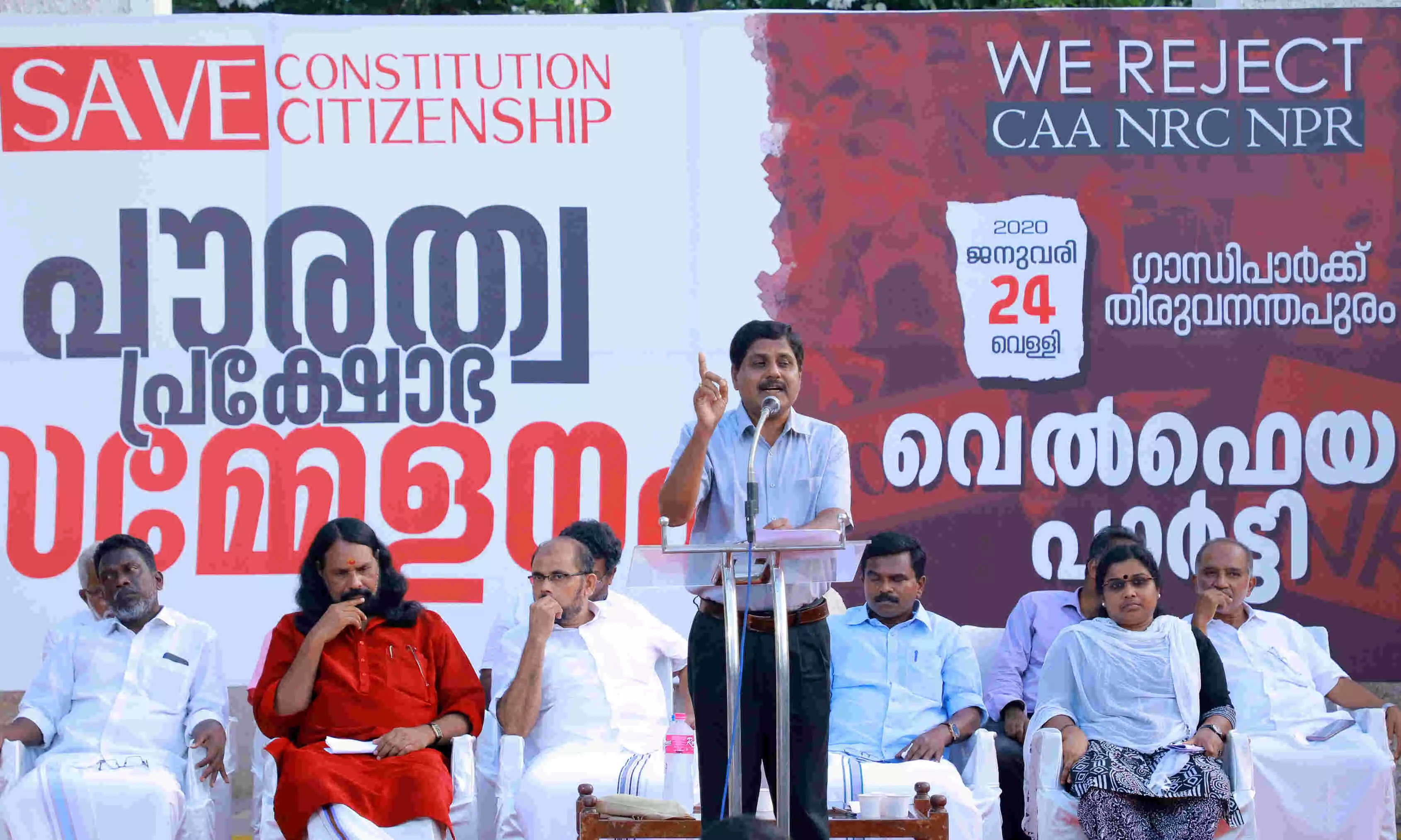 വെല്ഫെയര് പാര്ട്ടി സംസ്ഥാന പ്രസിഡണ്ട് ഹമീദ് വാണിയമ്പലം അധ്യക്ഷത വഹിച്ചു. കെപിസിസി ജനറല് സെക്രട്ടറി തമ്പാനൂര് രവി, മുസ് ലിം ലീഗ് സംസ്ഥാന സെക്രട്ടറി ബീമാപള്ളി റഷീദ്, എസ് ഡിപിഐ ജനറല് സെക്രട്ടറി തുളസീധരന് പള്ളിക്കല്, പിഡിപി സംസ്ഥാന വൈസ് ചെയര്മാന് വര്ക്കല രാജ്, വെല്ഫെയര് പാര്ട്ടി സംസ്ഥാന ജനറല് സെക്രട്ടറി കെ എ ഷഫീഖ്, സുരേന്ദ്രന് കരിപ്പുഴ, ശ്രീജ നെയ്യാറ്റിന്കര, എന് എം അന്സാരി സംസാരിച്ചു.