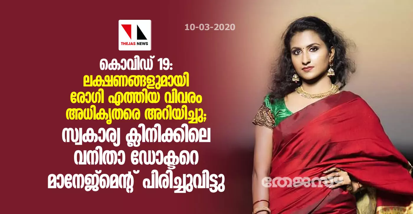 കൊവിഡ് 19: ലക്ഷണങ്ങളുമായി രോഗി എത്തിയ വിവരം അധികൃതരെ അറിയിച്ചു; സ്വകാര്യ ക്ലിനിക്കിലെ വനിതാ ഡോക്ടറെ മാനേജ്മെന്റ് പിരിച്ചുവിട്ടു