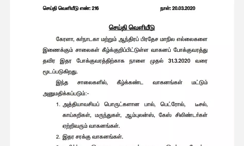 തിരുവനന്തപുരം: കൊറോണ വൈറസ് വ്യാപിക്കുന്ന പശ്ചാത്തലത്തില് തമിഴ്നാട്ടിലെ സംസ്ഥാന അതിര്ത്തികളില് വരുന്ന 31 വരെ വാഹനഗതാഗതം നിരോധിച്ചു. ചില വാഹനങ്ങള്ക്ക് ഇളവ് അനുവദിച്ചിട്ടുണ്ട്. അത്യാവശ്യ സാധനങ്ങളയ പാല്, പെട്രോള്, ഡീസല്, പച്ചക്കറികള്, ആംബുലന്സ്, ഗ്യാസ് സിലിണ്ടര് കൊണ്ടുവരുന്ന വാഹനങ്ങള് എന്നിവയ്ക്കും മറ്റ് ചരക്ക് വാഹനങ്ങള്ക്കും ഇളവുണ്ട്. മാറ്റിവയ്ക്കാന് സാധിക്കാത്ത തരം സംഭവങ്ങളില് പങ്കെടുക്കാനുള്ളവര് സഞ്ചരിക്കുന്ന ലഘു വാഹനങ്ങള്(മരണം തുടങ്ങിയവ), പൊതുജനങ്ങളുടെ സൗകര്യാര്ത്ഥം കുറഞ്ഞ അളവില്, അത്യാവശ്യ കാര്യങ്ങള്ക്ക് മാത്രം ഉപയോഗിക്കാവുന്ന സര്ക്കാര് ബസ്സുകള് എന്നിവയ്ക്കും ഇളവ് അനുവദിച്ചിട്ടുണ്ട്.