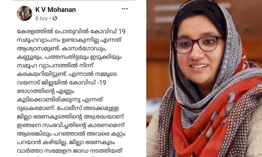 കേരളത്തില് പൊതുവില് കൊവിഡ് 19 സമൂഹവ്യാപനം ഉണ്ടാവുന്നില്ല എന്നത് ആശ്വാസമുണ്ട്. കാസര്കോഡും കണ്ണൂരും പത്തനംതിട്ടയും ഇടുക്കിയും സമൂഹ വ്യാപനത്തില് നിന്ന് കരകയറിയിട്ടുണ്ട്. എന്നാല് നമ്മുടെ വയനാട് ജില്ലയില് കൊവിഡ് 19 രോഗത്തിന്റെ എണ്ണം കൂടിക്കൊണ്ടിരിക്കുന്നു എന്നത് ദുഖകരമാണ്. പോലിസ് അടക്കമുള്ള ജില്ലാ ഭരണകൂടത്തിന്റെ അശ്രദ്ധയാണ് ഇങ്ങനെ സംഭവിച്ചതിന്റെ കാരണമെന്ന് ആരെങ്കിലും പറഞ്ഞാല് അവരെ കുറ്റം പറയാന് കഴിയില്ല. ജില്ലാ ഭരണകൂടം വാര്ത്താ സമ്മേളന ജാഡ നടത്തിയതുകൊണ്ട് ജാഗ്രതയാവുമെന്ന് കരുതുന്നുണ്ടെങ്കില് അത് ശരിയല്ലെന്നാണ് ഇവിടെ തെളിയുന്നത്. ഇവിടെ ഒരാളില് നിന്നാണ് കൂടുതല് ആളുകള്ക്ക് രോഗം വ്യാപിച്ചത്. ഇപ്പോഴാവട്ടെ രണ്ട് പോലിസുകാര് അടക്കം രോഗികളുമാണ്. ലോറി ഡ്രൈവറുടെ ക്ലീനര് പോവാതെ അയാളുടെ മകന് എങ്ങനെ ലോറിയില് പോയി എന്ന ചോദ്യത്തിന് മറുപടി പറയേണ്ടവര് മൗനം ദീക്ഷിക്കുന്നത് ആരെ രക്ഷിക്കാനാണ്. സര്ക്കാരിന്റെ നിര്ദേശങ്ങളില് നേരിയ അശ്രദ്ധയുണ്ടായാല് അപകടമുണ്ടാവുമെന്ന മുഖ്യമന്ത്രിയുടെ അഭ്യര്ത്ഥനയും വയനാട്ടുകാര് മുഖവിലയ്ക്കെടുക്കുന്നതേയില്ല. അതുകൊണ്ടാണ് ക്ലീനര്ക്ക് പകരം മകന് പോയതും മകന്റെ സ്നേഹിതന്റെ(ഇപ്പോള് രോഗാവസ്ഥയില് കഴിയുന്ന അള്) റൂട്ട് മാപ്പ് കൃത്യമായി ലഭിക്കാത്തതും.