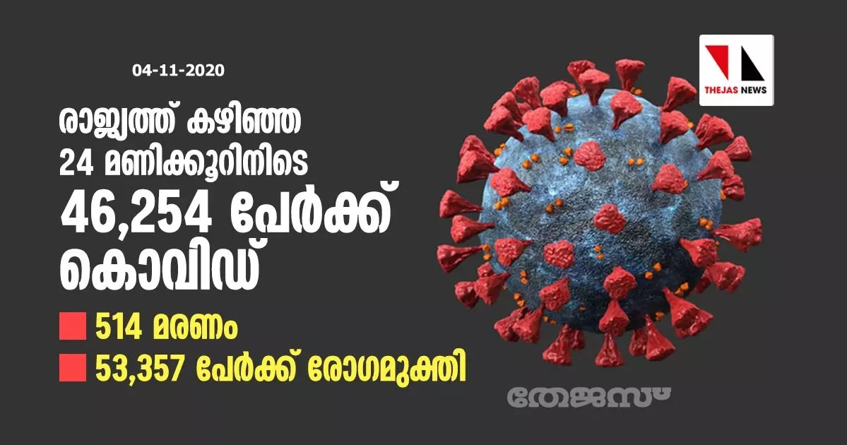 രാജ്യത്ത് കഴിഞ്ഞ 24 മണിക്കൂറിനിടെ 46,254 പേര്ക്ക് കൊവിഡ്; 514 മരണം; 53,357 പേര്ക്ക് രോഗമുക്തി