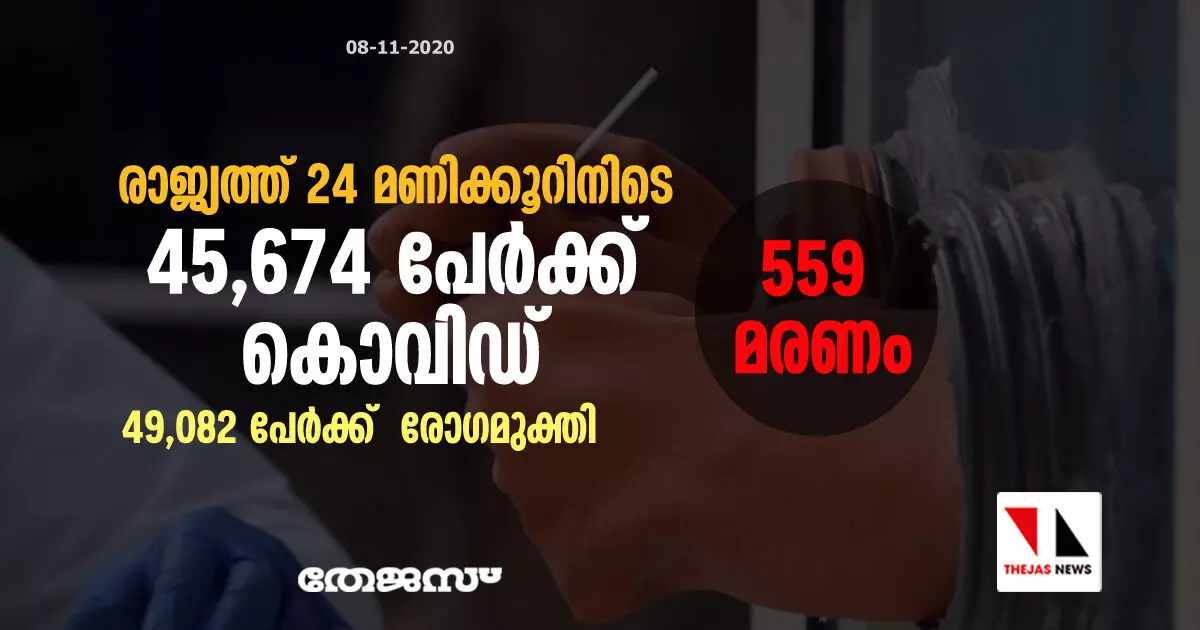 രാജ്യത്ത് 24 മണിക്കൂറിനിടെ 45,674 പേര്ക്ക് കൊവിഡ്; 559 മരണം; 49,082 പേര്ക്ക് രോഗമുക്തി