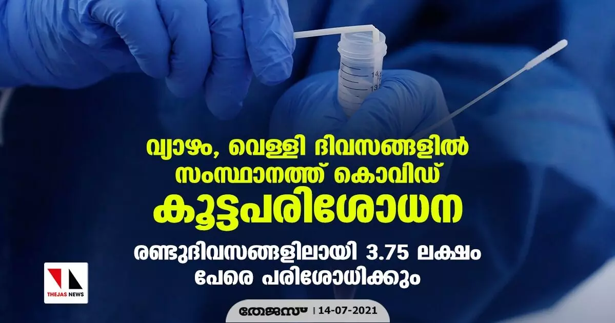 വ്യാഴം, വെള്ളി ദിവസങ്ങളില് സംസ്ഥാനത്ത് കൊവിഡ് കൂട്ടപരിശോധന; രണ്ടുദിവസങ്ങളിലായി 3.75 ലക്ഷം പേരെ പരിശോധിക്കും